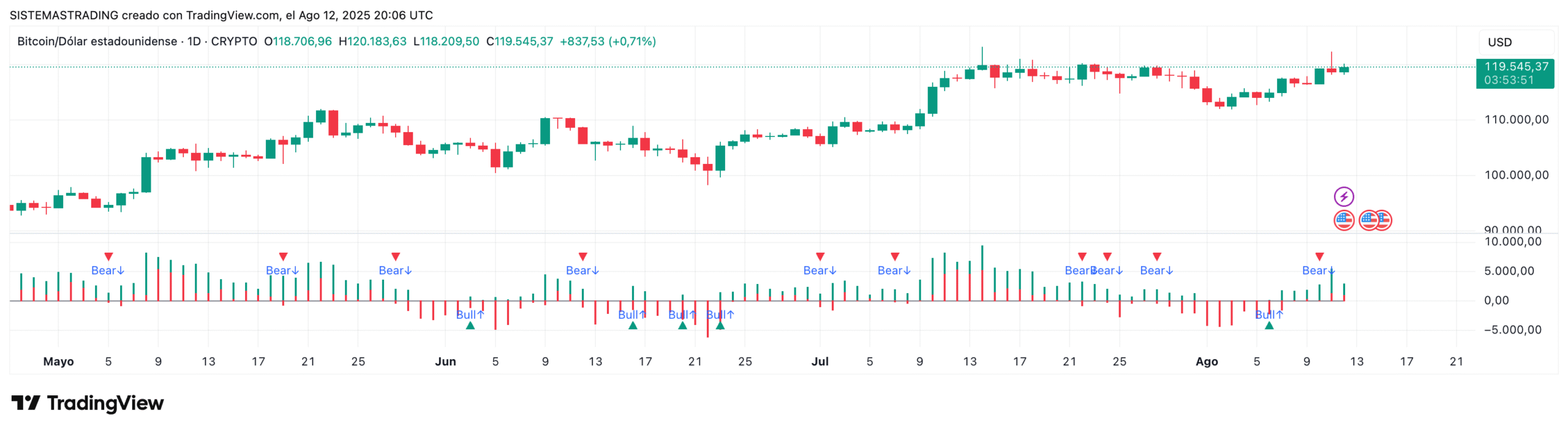 Si el precio marca nuevos máximos pero Bull Power no acompaña, aparece debilidad. Por ello, se sugiere prudencia. Asimismo, si el precio cae a nuevos mínimos y Bear Power no los confirma, puede gestarse un giro.