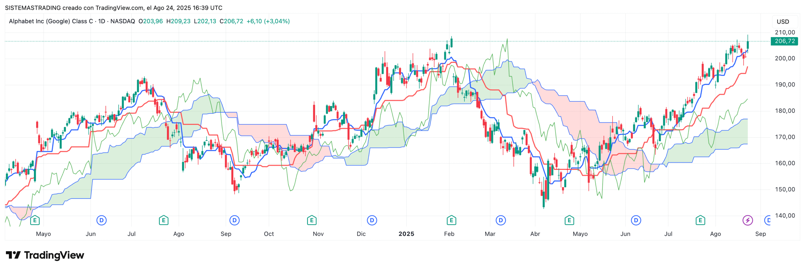 - Chikou Span: línea de retraso que confirma la tendencia.