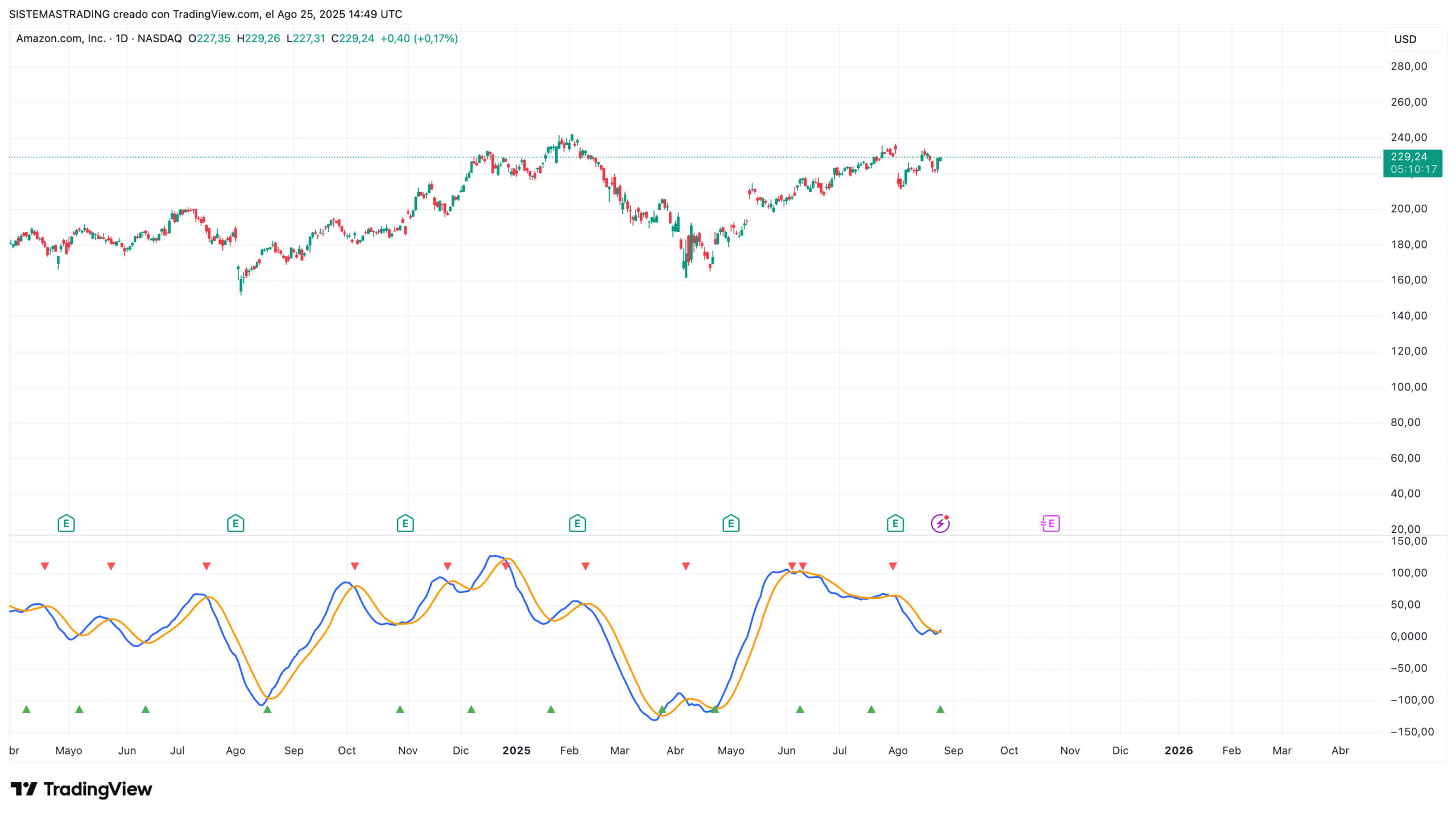 Junto al oscilador aparece una línea de señal derivada de una media móvil. Esta línea actúa como filtro y facilita la identificación de cruces claros.