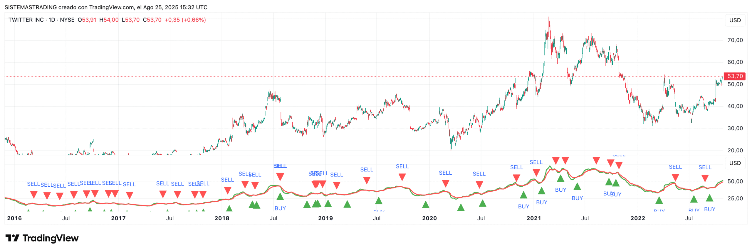 Cuando la media rápida cruza hacia arriba a la lenta, se considera una señal de compra. En cambio, cuando la rápida cruza hacia abajo, se interpreta como señal de venta.