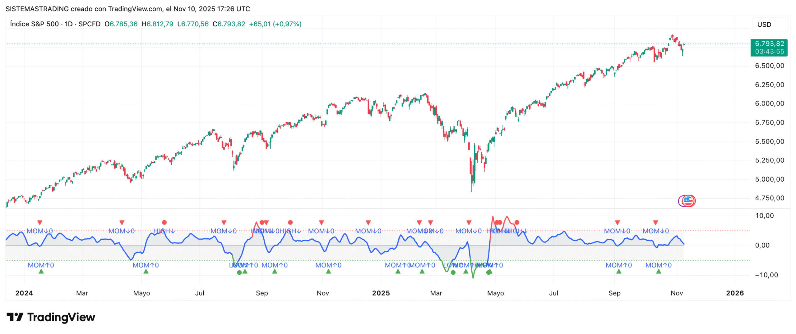 location=location.bottom, size=size.tiny, color=color.new(color.green, 0), text=»MOM↑0″)